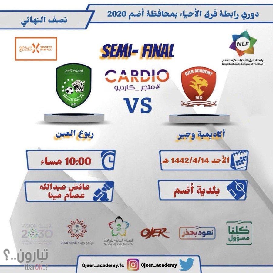 يلتقي اليوم اكاديمية وجيرو Vs ربوع العين بنصف نهائي دوري رابطة فرق أحياء محافظة أضم بتمام الساعه 10 مسأ على ملعب بلدية أضم بتعليق عائض عبدالله و عصام مينا