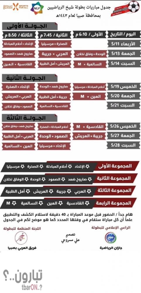 تعرف على جدول مباريات بطولة شيخ الرياضيين با اشراف اللجنه العليا "فريق العربي" والراعي الاعلامي "جازان الرياضيه" .