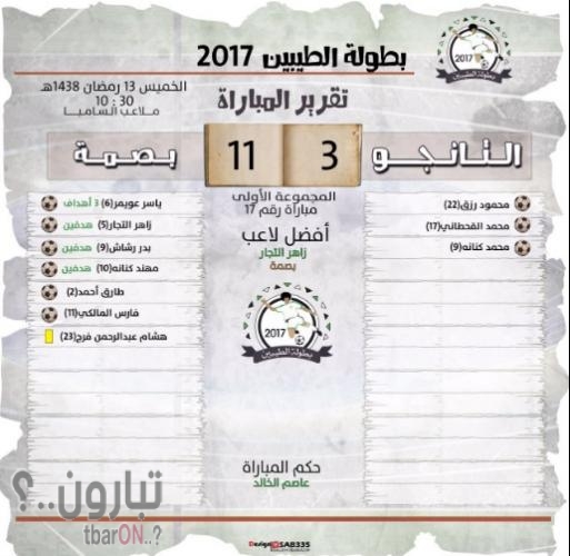 شهد ملعب السامبا بالرياض يوم الخميس 13 من رمضان 1438 هـ في تمام الساعة 10.30 مساءا المجموعة الاولى مباراة رقم 17 من بطولة الطيبين حيث اقيمت مباراة بين فريق التانجو وفريق بصمة .